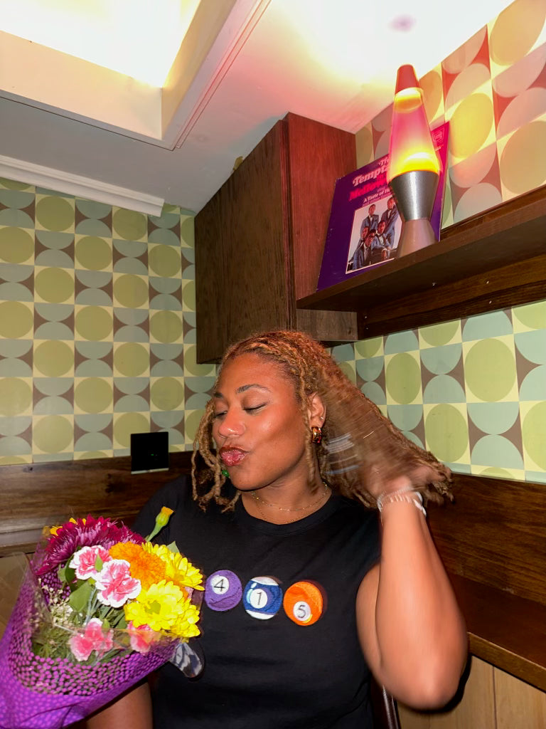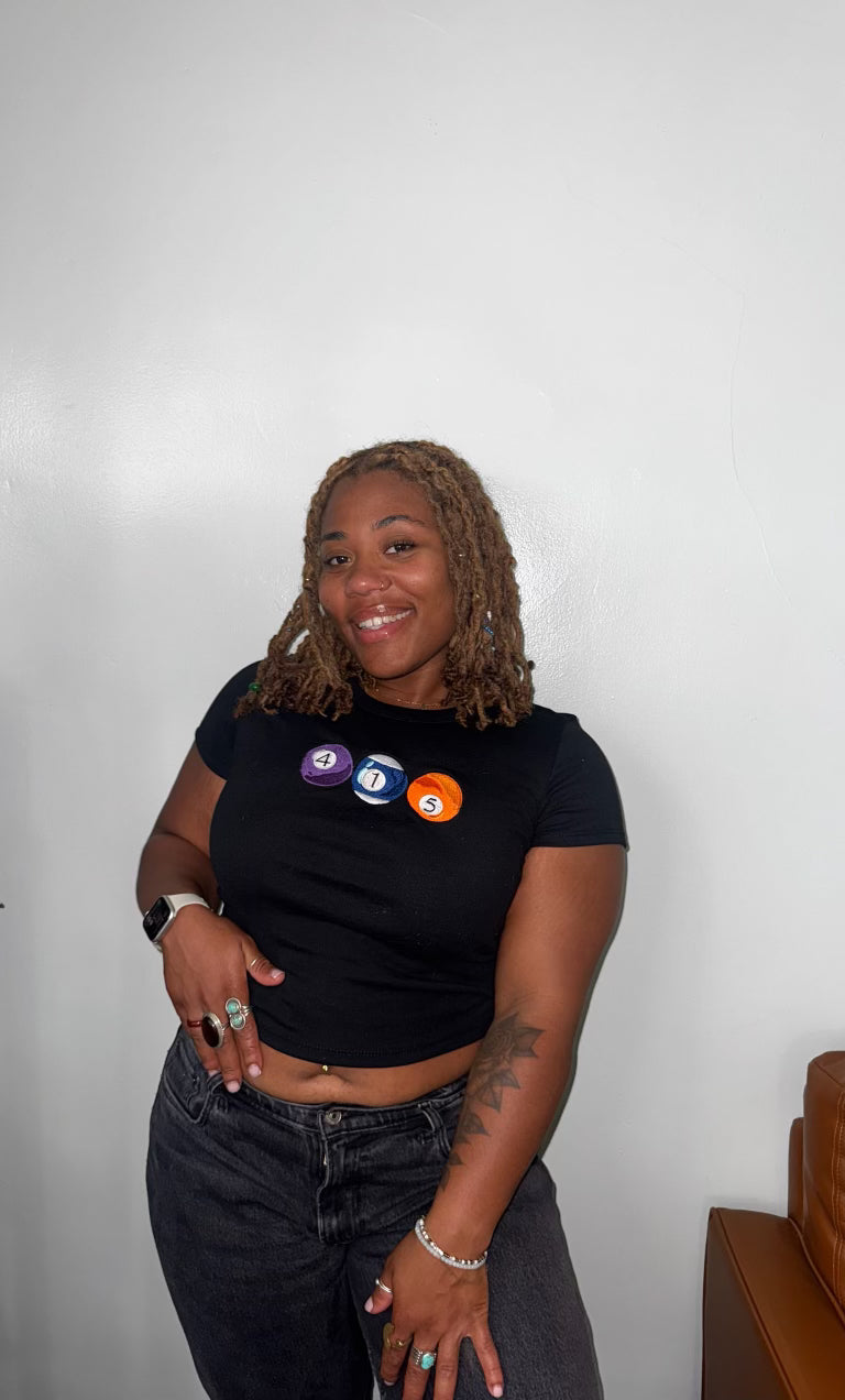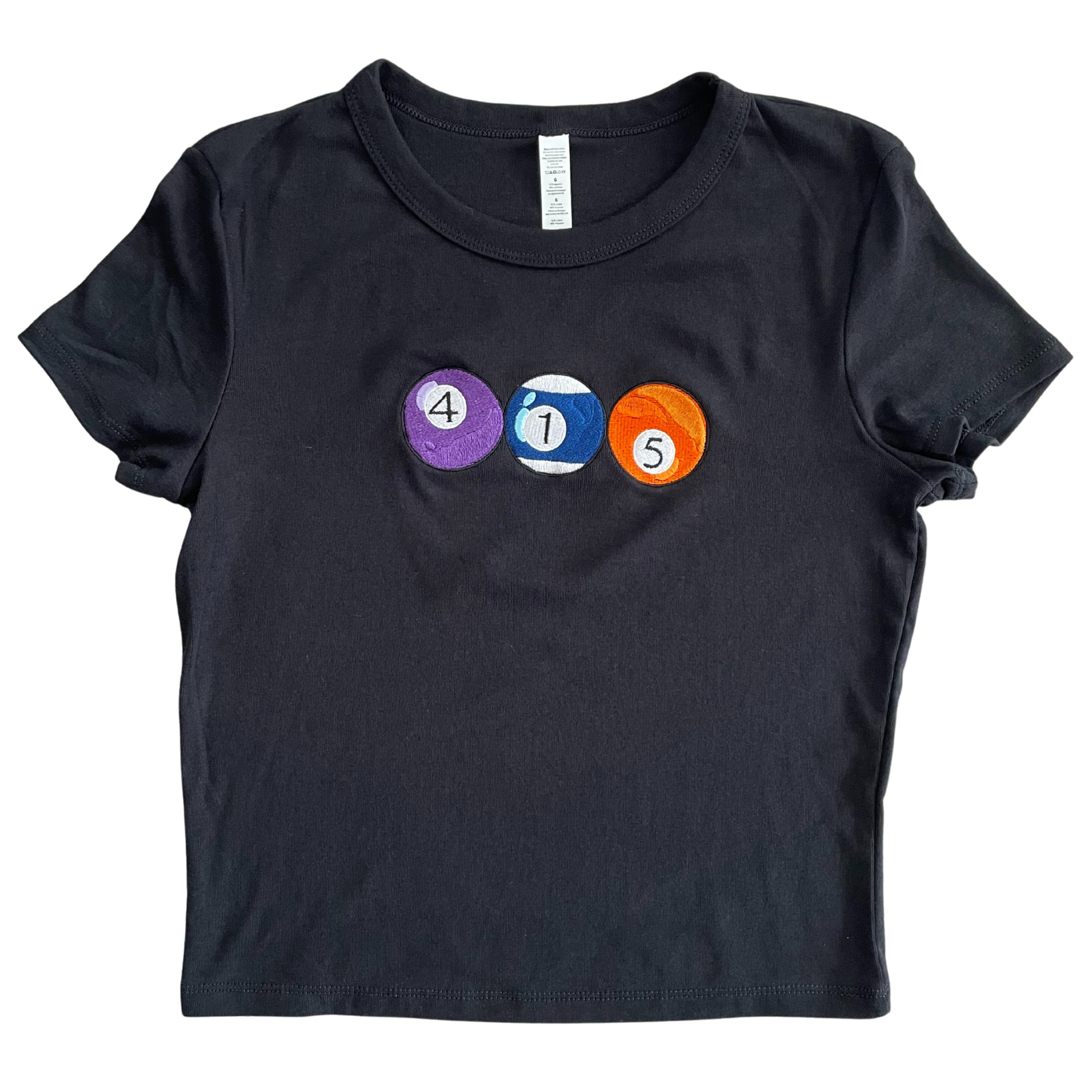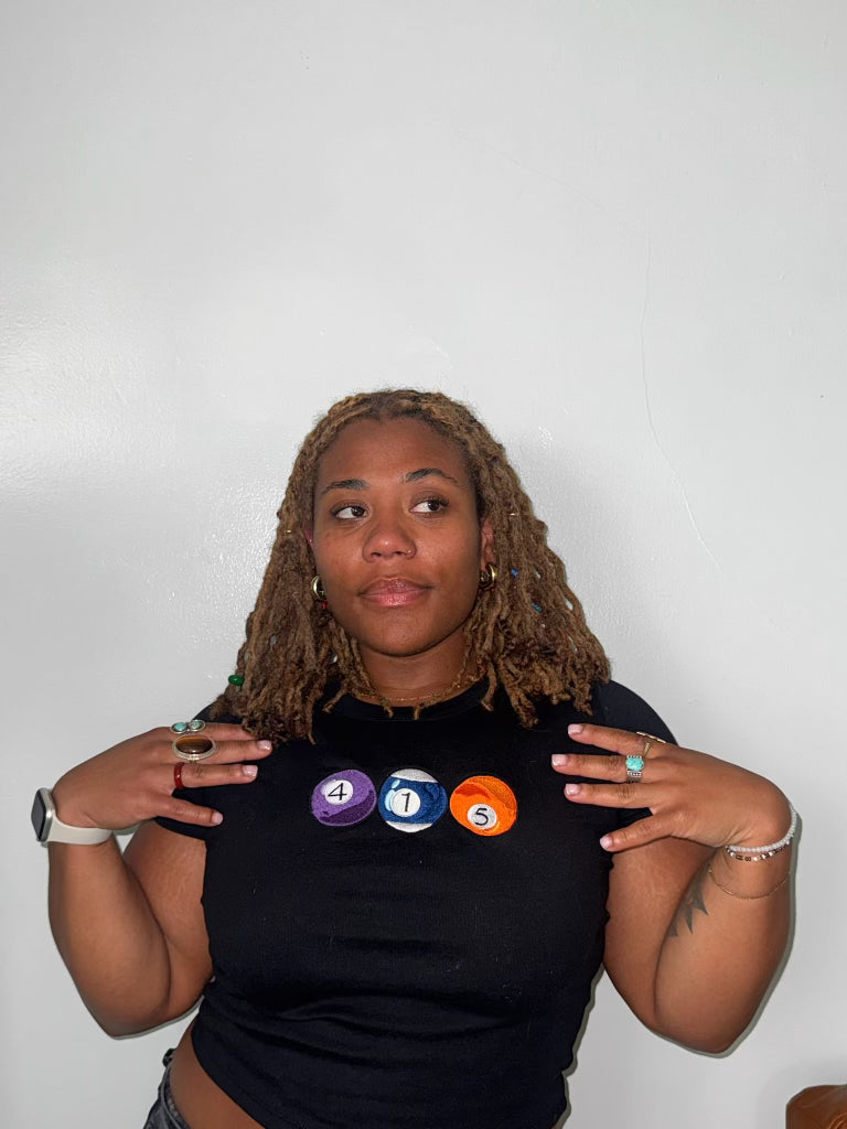 The 415 deserves some love too! Thank you for being patient with me SF peeps. This is also available on a Green American Apparel BBT from Small - XL. Did you know that the design is pretty accurate in terms of colors and numbers? The 4 ball is actually purple and the striped blue ball is a 10 but I made it a 1 and the 5 is actually an orange ball. Close enough!