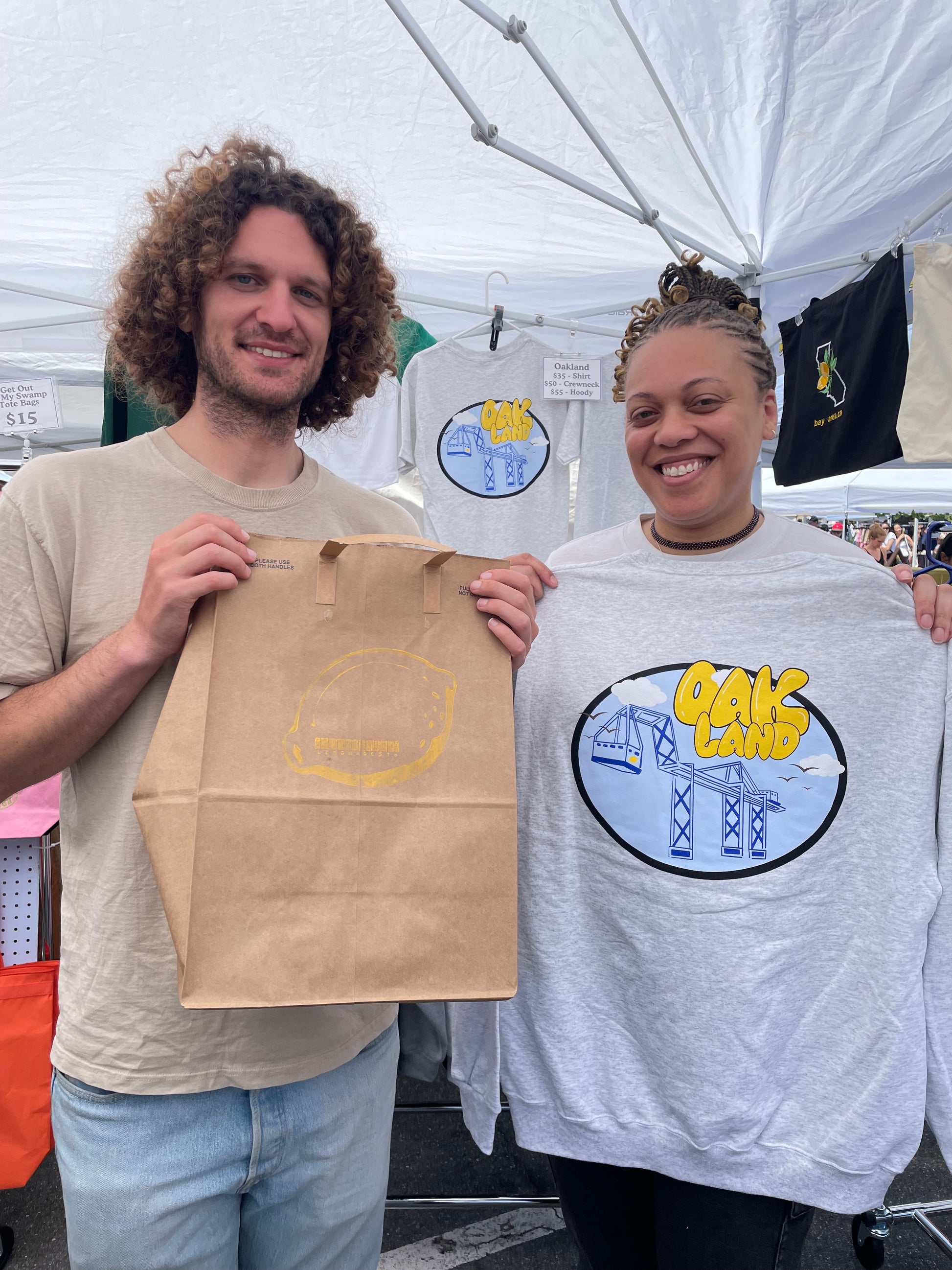 This vibrant item is perfect for Oakland lovers. On the front chest, "Oakland" is spelled out in big bright yellow bubble letters. It's eye catching brightness is something that is bound to put a smile on anyones face. On the back is a large oval including a dark blue crane holding a crate with a lemon on the side with a light blue sky with clouds and birds.