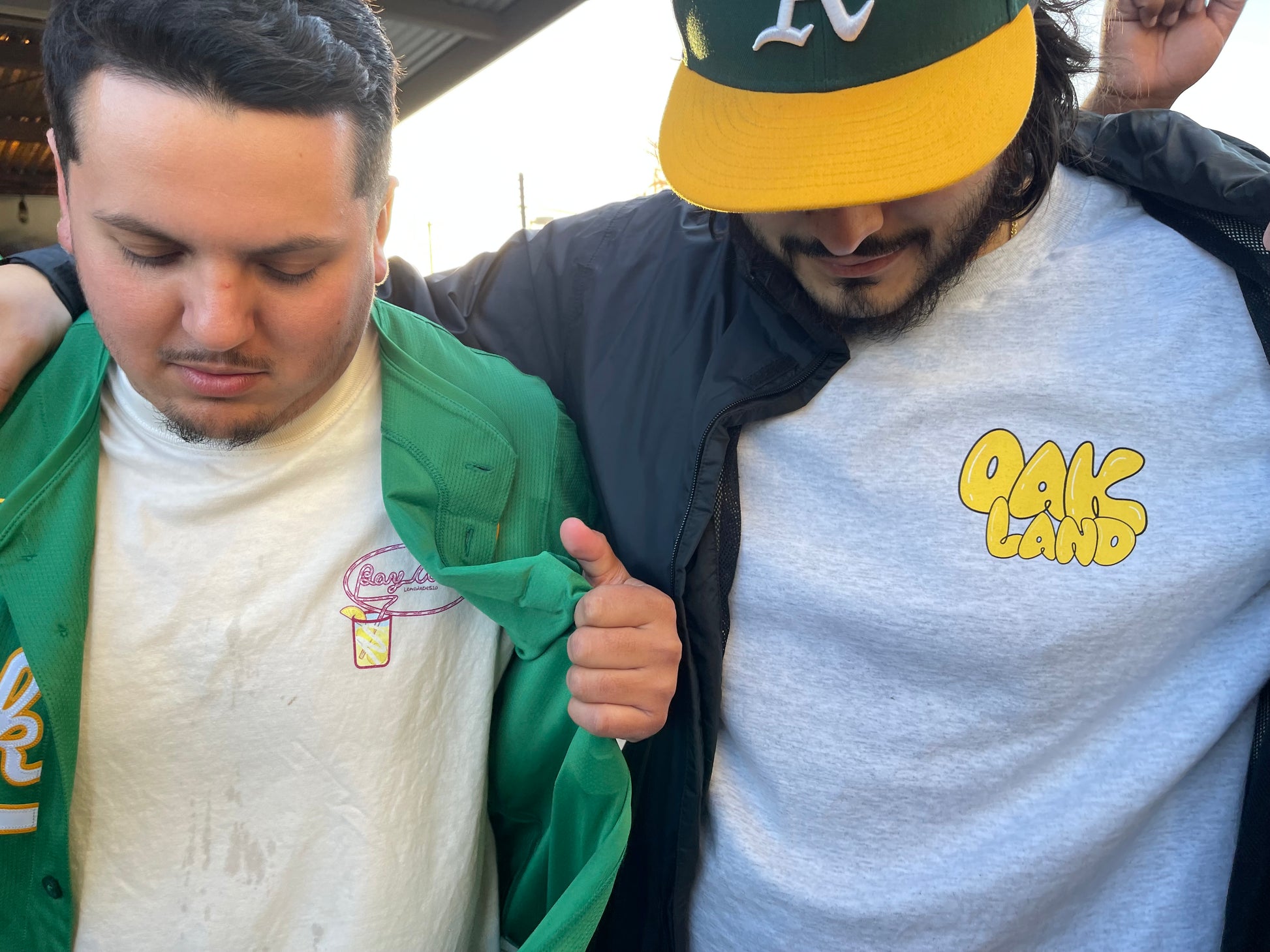 This vibrant item is perfect for Oakland lovers. On the front chest, "Oakland" is spelled out in big bright yellow bubble letters. It's eye catching brightness is something that is bound to put a smile on anyones face. On the back is a large oval including a dark blue crane holding a crate with a lemon on the side with a light blue sky with clouds and birds.
