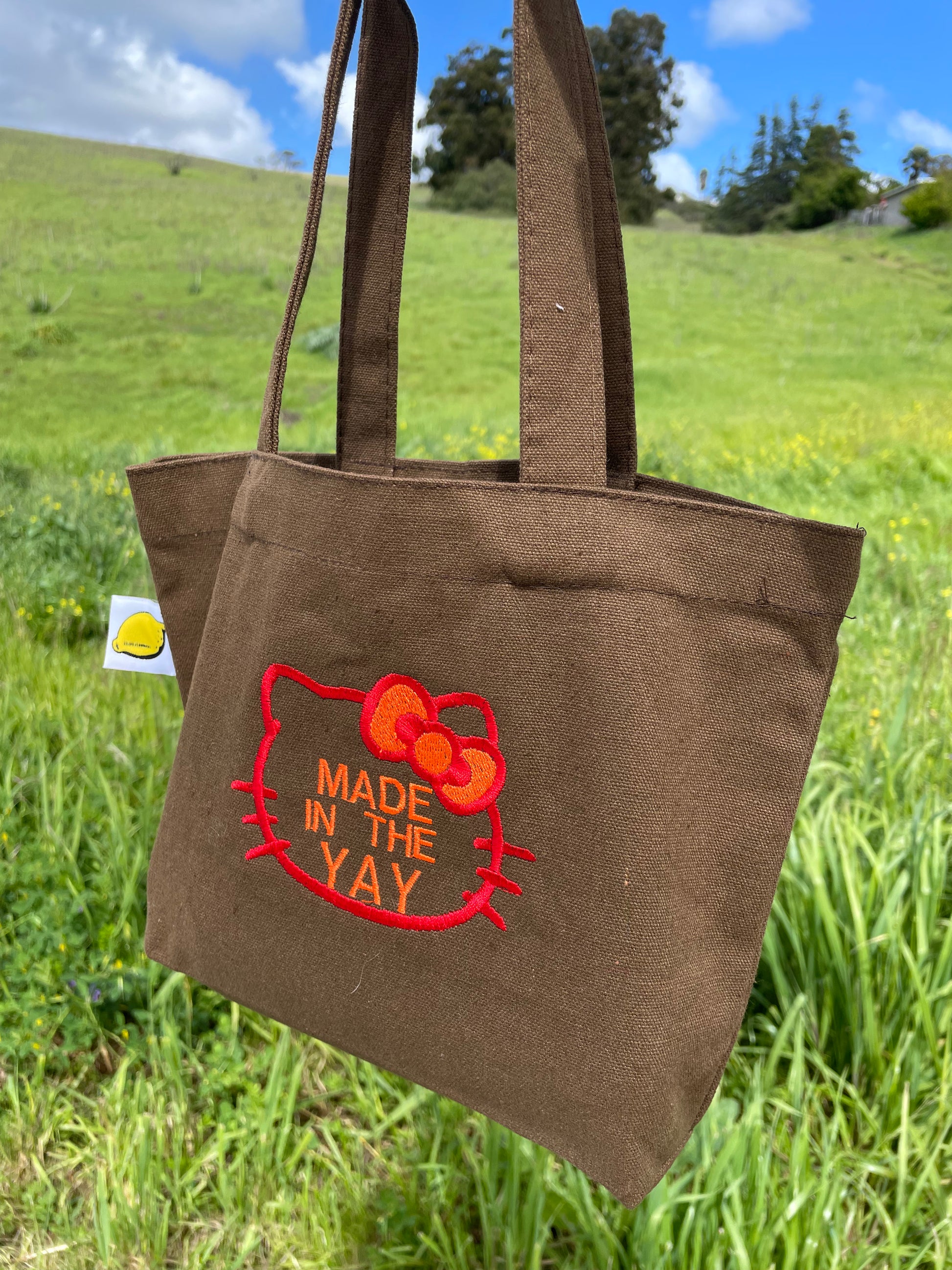 Specifically made for those Sanrio lovers that were made In the Yay, you know who you are. Isn't this just the cutest thing you've seen? A Hello Kitty outline with red thread and "Made in the Yay" in all caps with orange thread. Show your love for Hello Kitty and the Yay Area by rocking this everyday tote that can hold your everyday accessories including your phone, stizzy, keys, water bottle, lighter, clipper card, and anything else you may need on your adventure into the city or on BART.