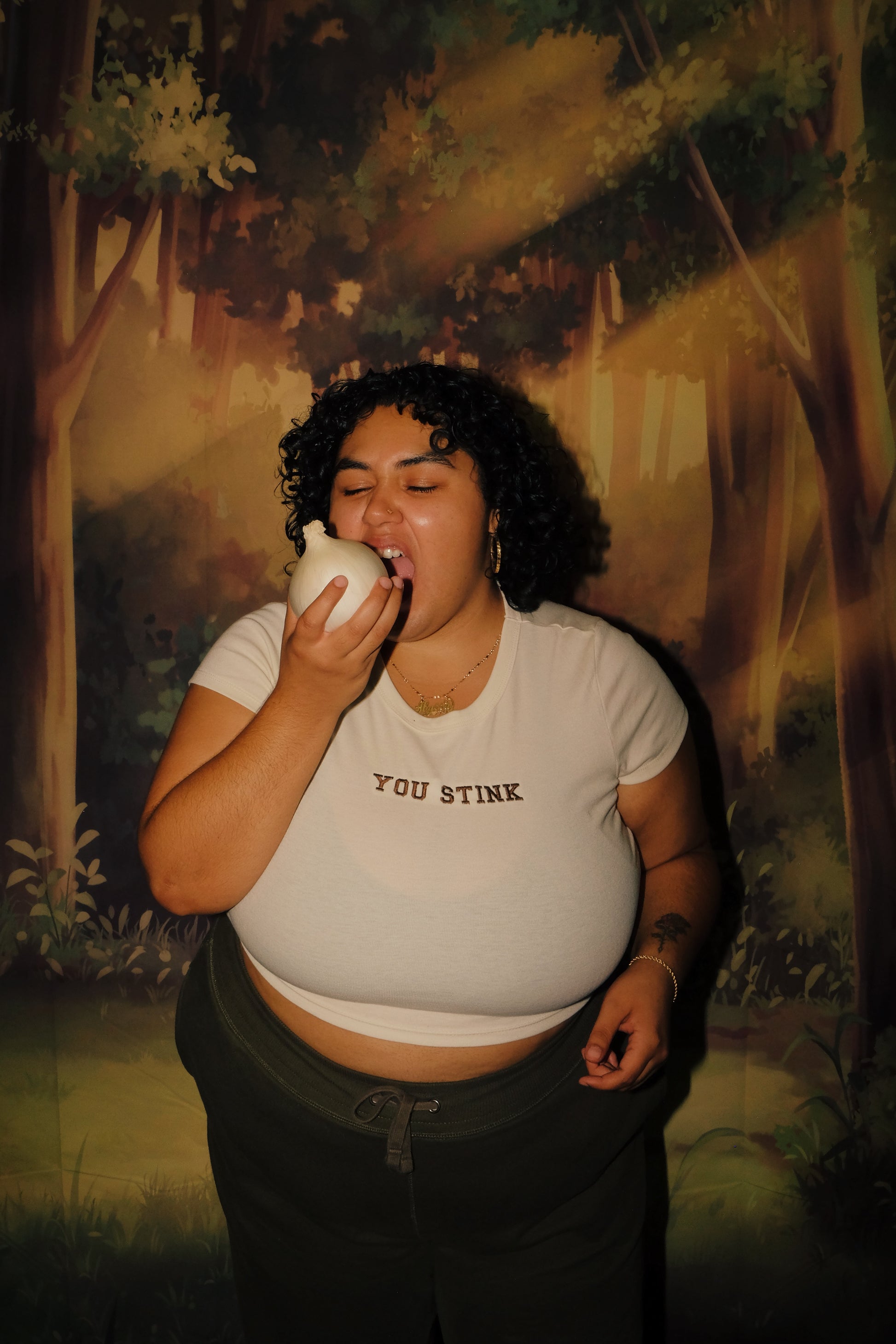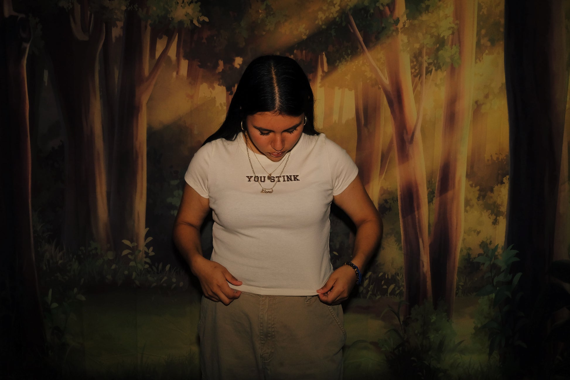 YOU STINK embroidered in all caps on a creme shirt with brown thread.